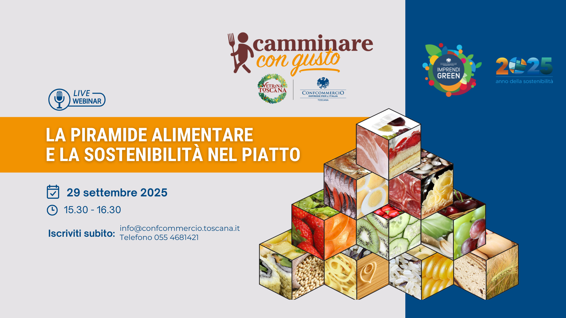 Lunedì 29 settembre dalle ore 15.30 il webinar gratuito di Confcommercio Toscana, inserito nel progetto Camminare con Gusto, finanziato dalla Regione Toscana nell’ambito del Programma Vetrina Toscana. Per seguire l’evento, basta compilare il form di iscrizione. L’incontro è rivolto a imprenditori e operatori del settore alimentare, ristoratori, pasticceri, gelatai, baristi e professionisti della ristorazione collettiva interessati ad approfondire i legami tra alimentazione equilibrata, sostenibilità e innovazione.