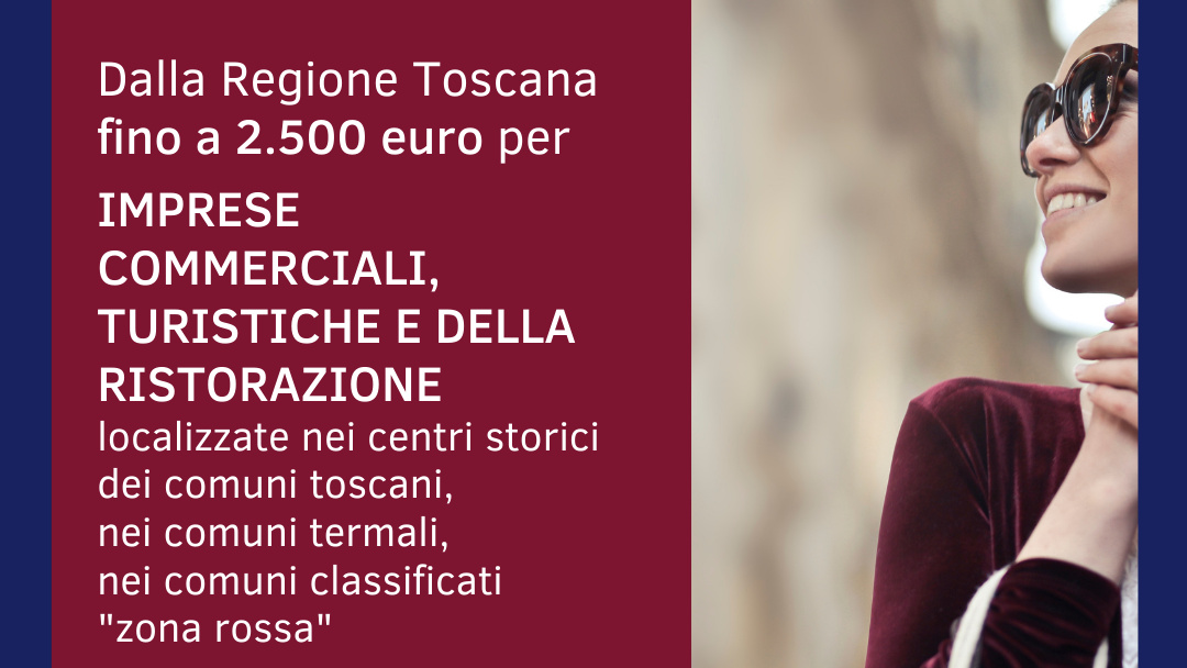 Potranno ottenere dalla Regione Toscana un contributo fino a 2.500 euro a fondo perduto, purché siano ubicate nei centri storici dei comuni toscani, nei comuni termali o in quelli definiti come “zona rossa” e abbiano avuto un calo di almeno il 30% di fatturato e corrispettivi tra 2020 e 2019. Domande al via dal 17 gennaio 2021. Per informazioni, contattare la sede territoriale Confcommercio di riferimento.