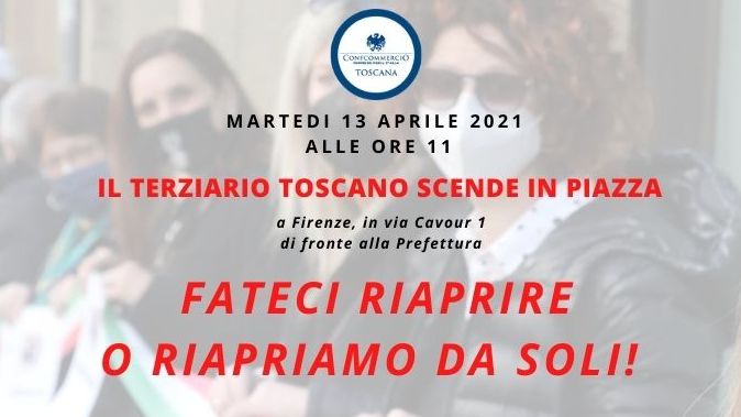 Martedì 13 aprile 2021 a Firenze la manifestazione organizzata da Confcommercio Toscana: sotto la prefettura di Firenze si sono ritrovati oltre mille imprenditori del terziario da tutta la Toscana. Una delegazione è stata poi ricevuta dal Prefetto Alessandra Guidi, poi dal presidente della Regione Toscana Eugenio Giani e dall’assessore Leonardo Marras, ai quali è stato consegnato un documento con le richieste della categoria. Una su tutte, la data certa di riapertura di tutte le attività del terziario. Senza più blocchi, senza limitazioni, senza più calendari scanditi dai colori. Una ripresa vera con un solo unico impegno: conciliare salute e lavoro, nel pieno rispetto delle normative anticontagio. Poi, il blocco dei costi e una spinta decisiva al piano vaccinale.
