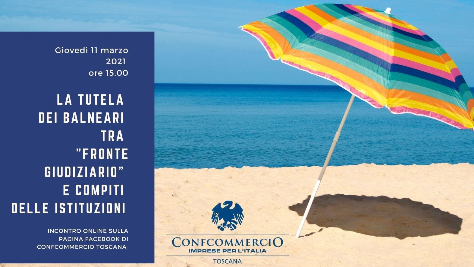 Tra fronte giudiziario e compiti delle istituzioni, il Sindacato Balneari di Confcommercio cerca di trovare una soluzione al contenzioso che si sta aprendo nei confronti delle Amministrazioni Comunali della costa toscana, dopo che l'Antitrust ha promosso un ricorso al Tar contro il Comune di Piombino per far dichiarare l'illegittimità delle proroghe delle concessioni demaniali al 2033 formalizzate ai balneari. Se ne parla giovedì 11 marzo 2021, alle ore 15 in diretta online sulla pagina Facebook di Confcommercio Toscana. Interverranno il presidente nazionale di SIB avv. Antonio Capacchione, la presidente di SIB Toscana avv. Stefania Frandi e la prof.ssa avv. Elisa Scotti. Introduce e modera gli interventi il direttore di Confcommercio Toscana Franco Marinoni.