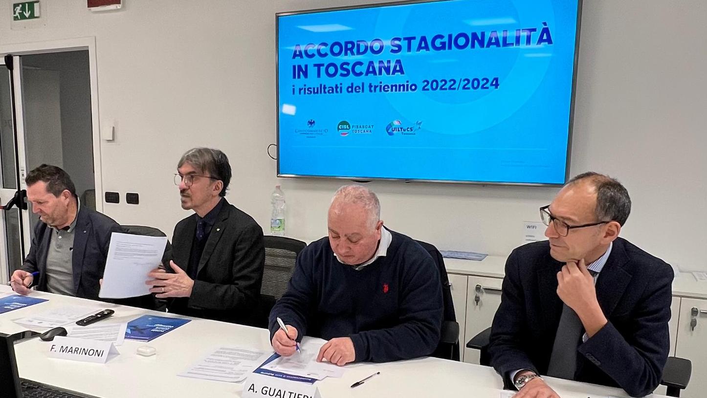 A siglare l’intesa Confcommercio Toscana e i sindacati regionali Fisascat Cisl e Uiltucs Uil dopo la scadenza del primo accordo, firmato nel 2022, che ha dato ottimi risultati in termini di miglioramento della qualità dell’occupazione stagionale e dell’operatività delle imprese. La presentazione delle novità durante la conferenza stampa a Firenze alla presenza del direttore generale di Confcommercio Toscana Franco Marinoni e dei segretari generali di Fisascat-Cisl Toscana Alessandro Gualtieri e di Uiltucs-Uil Toscana Marco Conficconi.