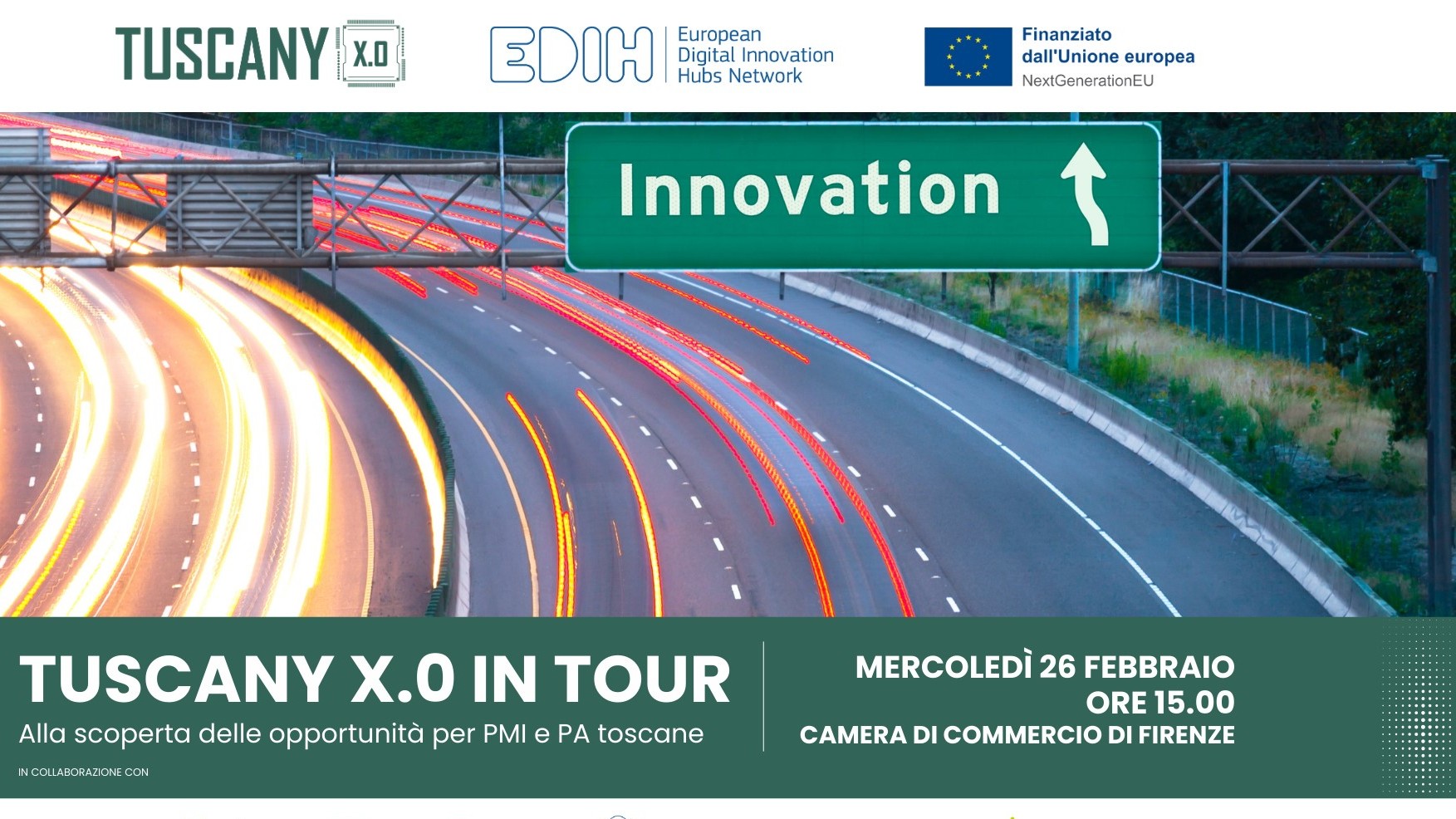 Mercoledì 26 febbraio alle ore 15.00 la Camera di Commercio di Firenze ospita la prima tappa di Tuscany X.0 in Tour, un roadshow dedicato alla trasformazione digitale e sostenibile delle PMI e delle pubbliche amministrazioni toscane. Organizzato nell’ambito del progetto europeo Tuscany X.0, si tratta di un’opportunità concreta per le aziende che vogliono digitalizzarsi e rendere i propri processi più sostenibili. Grazie a coperture finanziarie fino al 100% per i servizi offerti, l’innovazione diventa accessibile a tutti. Scopri come iscriverti